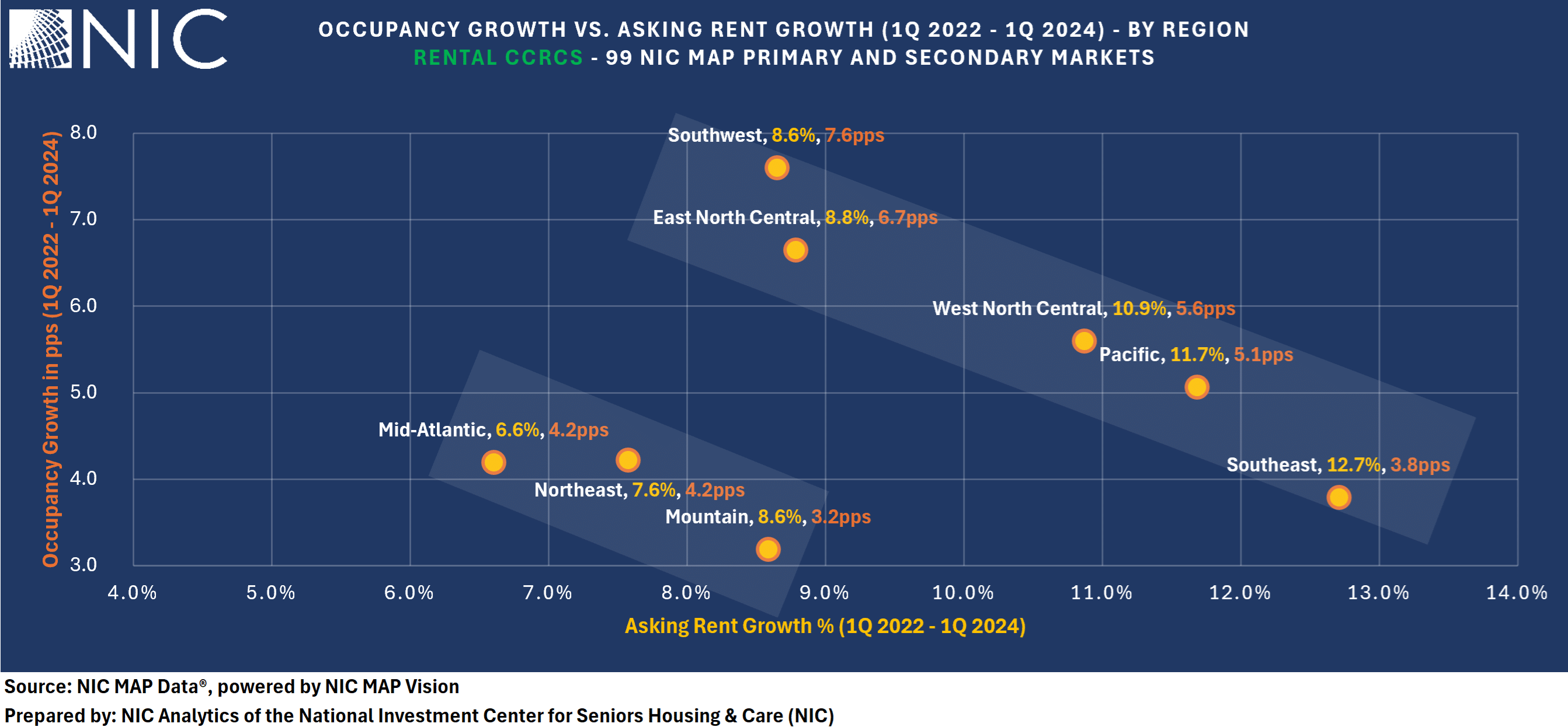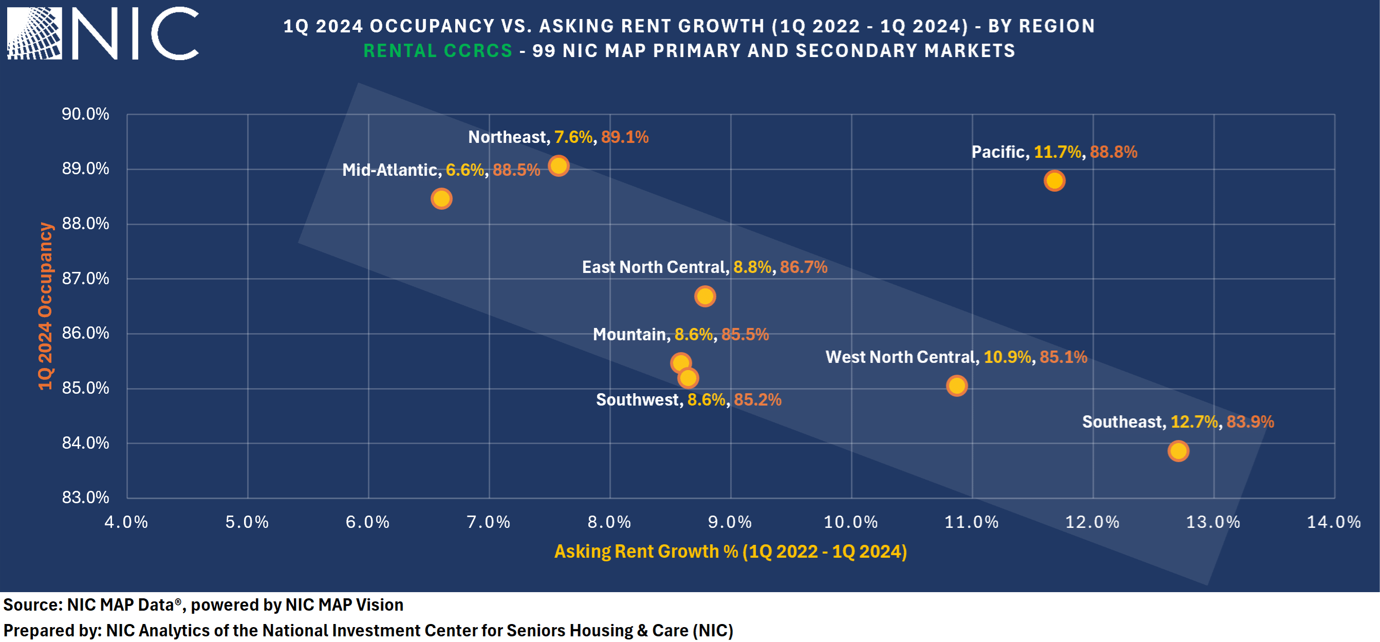 Regions with higher occupancy rates, such as the Northeast and Mid-Atlantic, reported relatively smaller rent growth. In contrast, regions like the Southeast showed the highest rent growth but the lowest occupancy rate.