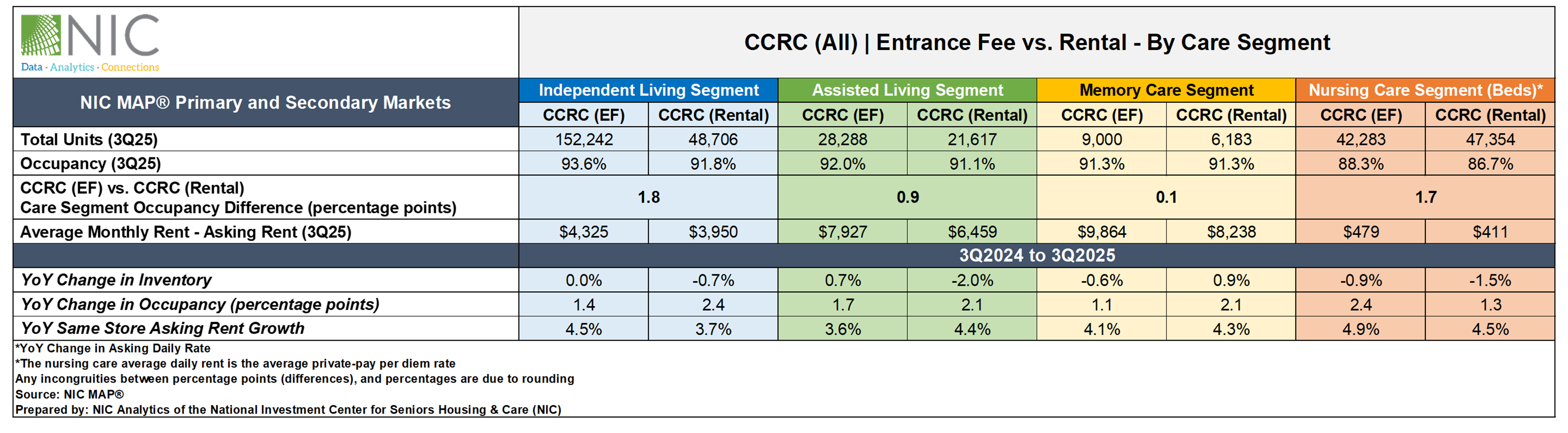 3Q 2025 Market Fundamentals by Care Segment – Entrance Fee vs. Rental CCRCs