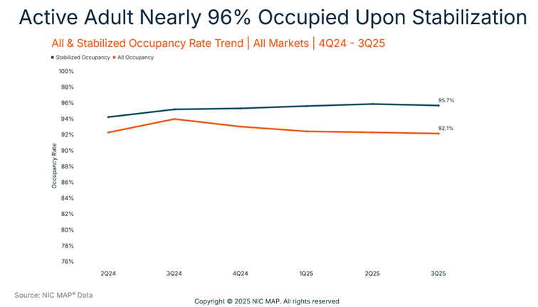 - The active adult occupancy rate stood at 92.1% in the third quarter, edging down 0.2 percentage points from the prior quarter, but still well above 90% occupied.