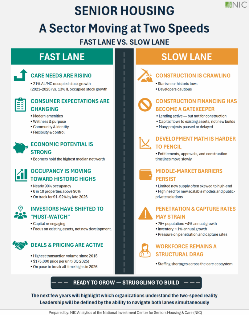 Potential challenges in 2026 include headline exposure stemming from any additional high-profile CCRC bankruptcies. While such events tend to attract national media attention, their impact is often more localized. Existing residents may seek better financial transparency and communication from communities, while prospective residents may delay or hesitate in making move-in decisions. Even when market fundamentals remain strong, such a headline risk can temporarily weigh on demand and lengthen closing cycles for CCRCs.