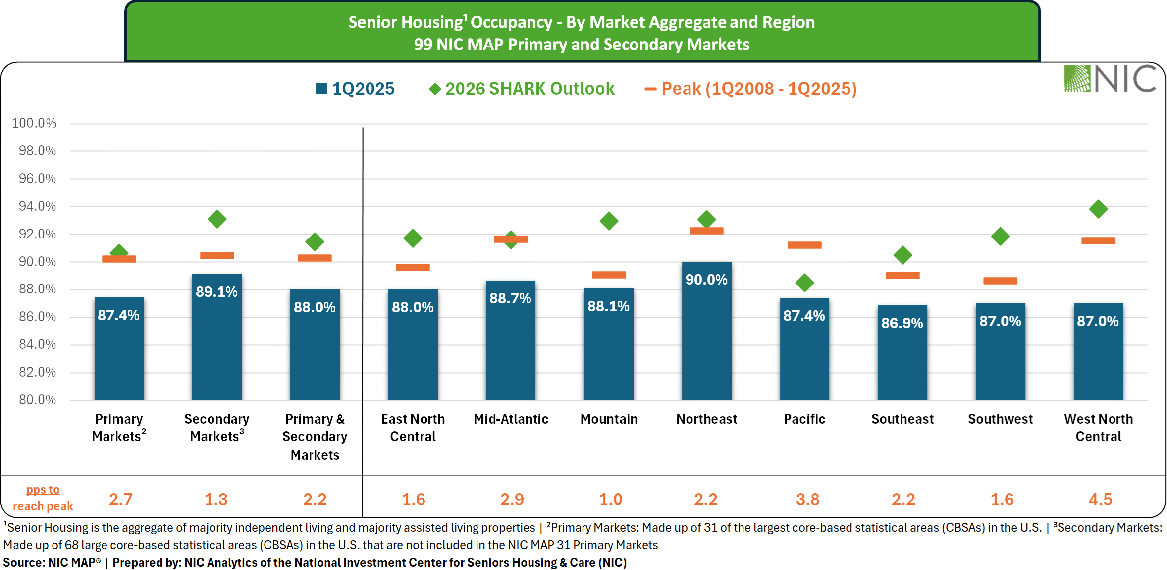 The exhibit below demonstrates regional occupancy rates for entrance fee and rental CCRCs across the 99 primary and secondary NIC MAP markets. Each bar represents occupancy as of the first quarter of 2025, while the markers above the bars indicate the highest occupancy recorded for each region since the first quarter of 2008. The difference between the current bar and its marker highlights the gap between present occupancy and each region’s historical peak.