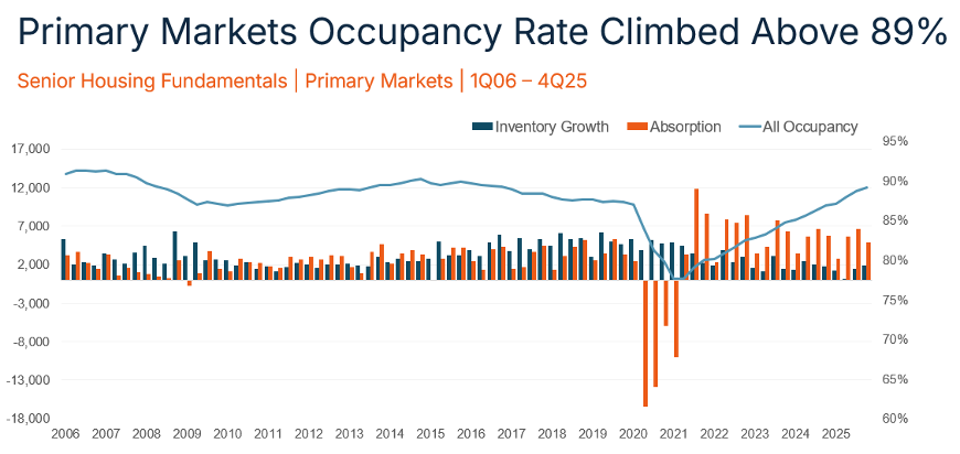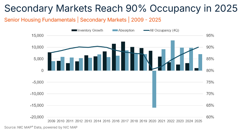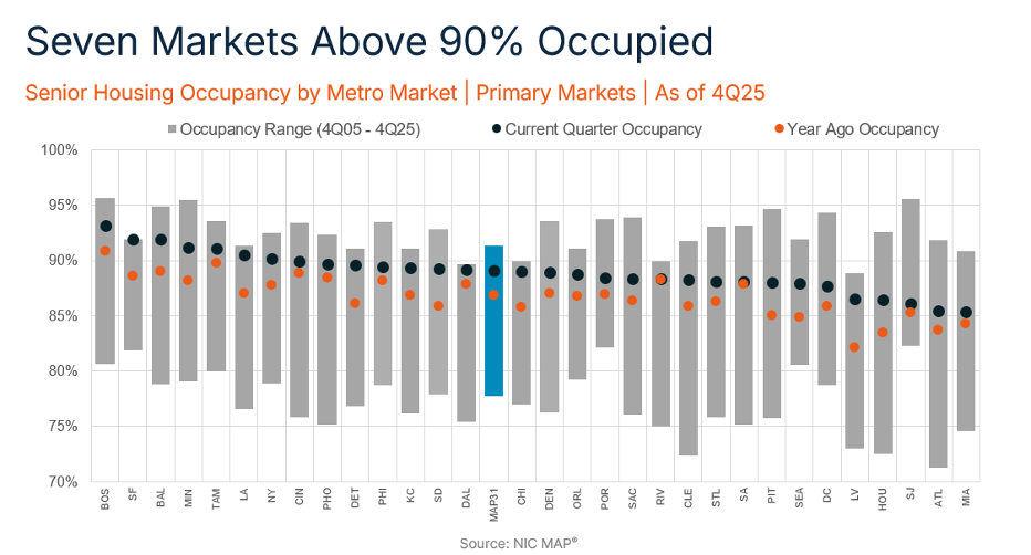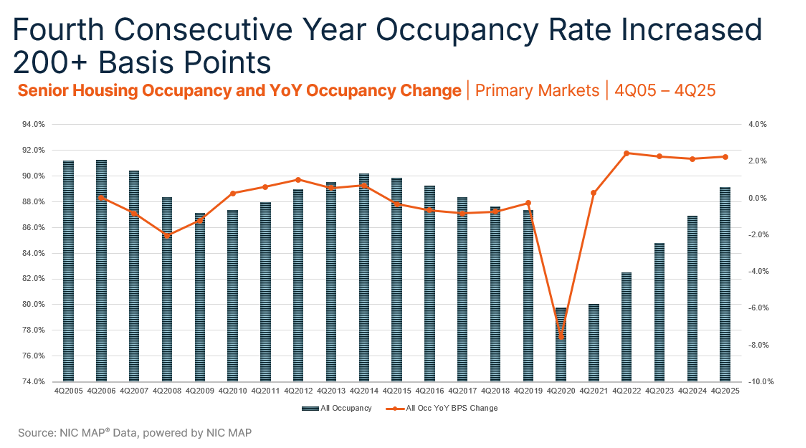 The occupancy rate for senior housing rose 2.2 percentage points in 2025 for the 31 NIC MAP Primary Markets, marking the fourth consecutive year in which occupancy gained more than 200 basis points.