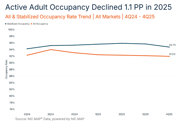 The active adult occupancy rate stood at 91.9% in the fourth quarter, edging down 0.2 percentage points from the prior quarter and declining 1.1 percentage points for the full year 2025.