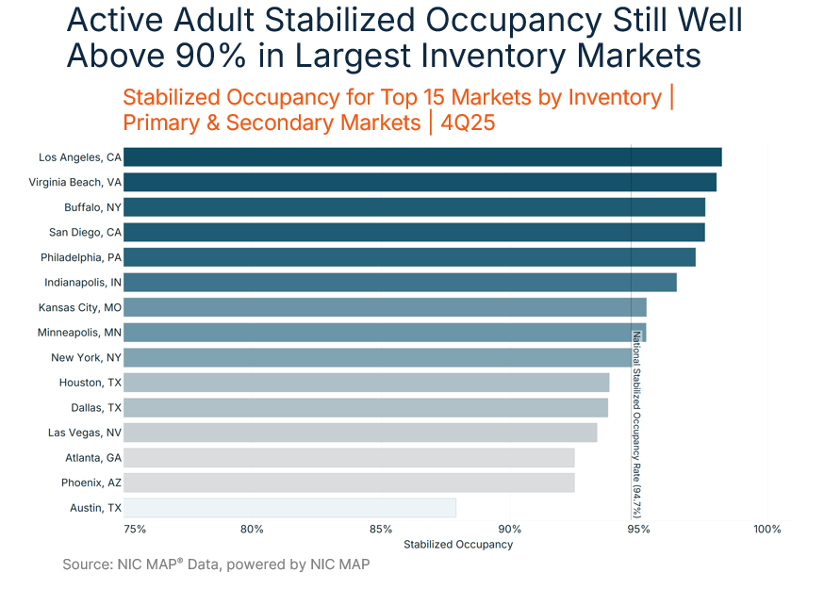 With stabilized occupancy rates near 96%, active adult communities are poised for another year of positive performance in 2026.