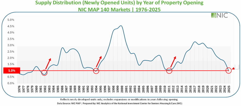 Today, senior housing finds itself once again at that same one-percent threshold (support level). This suggests we are in the early innings of the next supply cycle. But unlike prior cycles, the context has fundamentally changed.