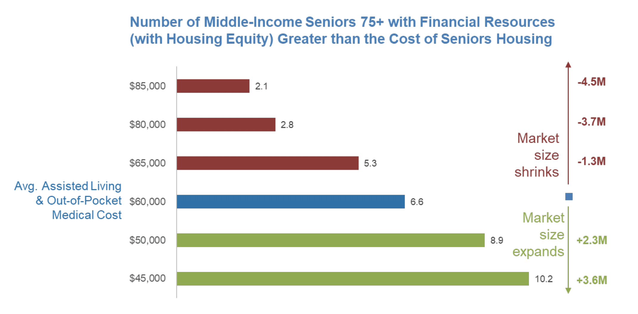 Assisted Living: In 2014 dollars, we conservatively assume that the average annual cost of assisted living rent and medical out-of-pocket costs is about $60,000. In fact, these represent low-end estimates for medical out-of-pocket and housing with very limited care included. Even then, only 19 percent (2.7 million) of middle market seniors 75 and older will have annual financial resources of $60,000 or more in 2029. If we include housing equity for these seniors, then 46% (6.6 million) of them will have financial resources over $60,000 per year.