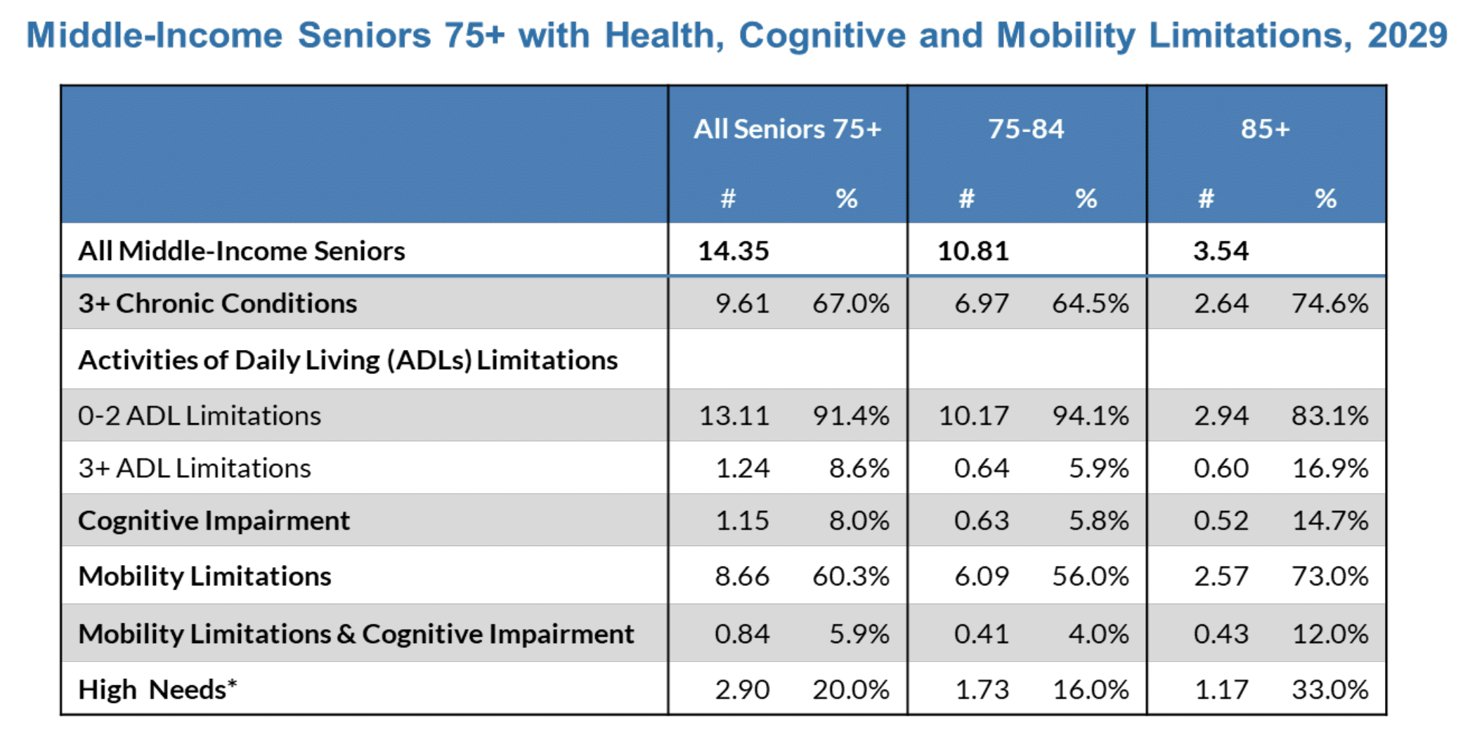 The onset or anticipated onset of health and mobility challenges is a common motivator for seniors to transition out of their homes to independent or assisted living. As we examine the 14.4 million middle market seniors, we project that many of them will have serious health conditions or care needs. Twothirds of seniors 75 and over are projected to have three or more chronic conditions in 2029, and 20 percent of seniors will have high needs—meaning they have three or more chronic conditions and at least one limitation in activities of daily living. Sixty percent of seniors are expected to have mobility limitations, which may make it difficult for them to navigate their homes independently. As shown below, prevalence of these conditions increases markedly in the group that is 85 and older, which suggests that care needs may grow dramatically when the Baby Boomers reach this age.